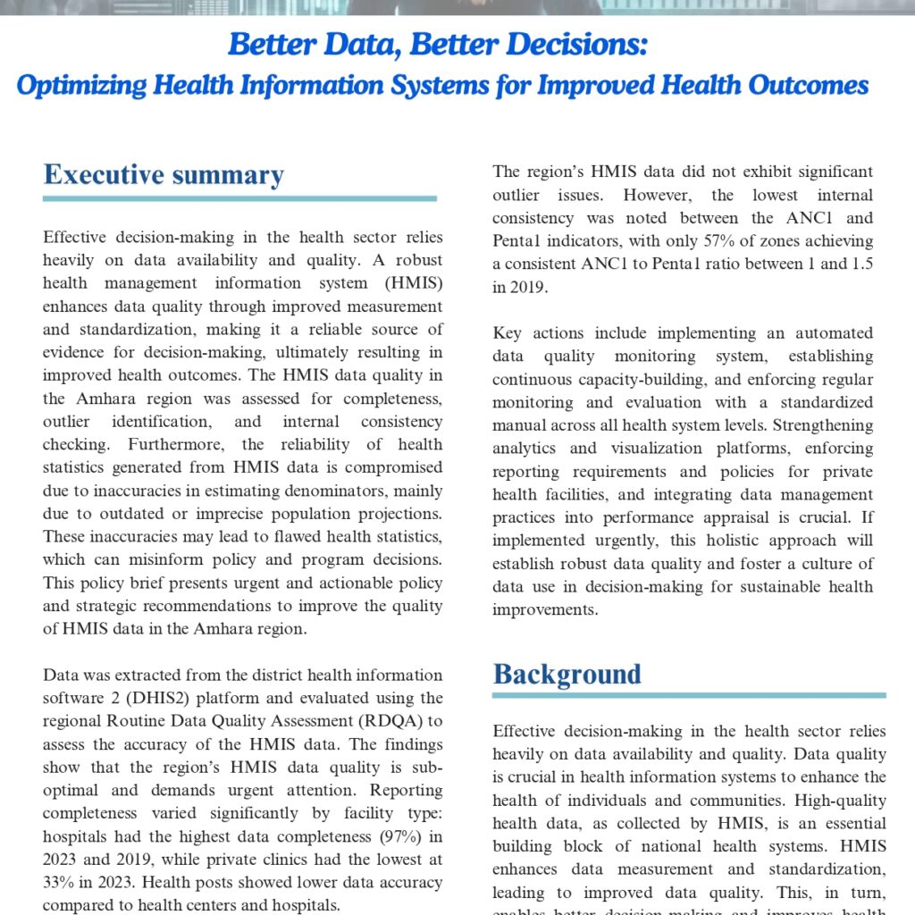 health management information system (HMIS) enhances data quality through improved measurement and standardization, making it a reliable source of evidence for decision-making, ultimately resulting in improved health outcomes. The HMIS data quality in the Amhara region was assessed for completeness, outlier identification, and internal consistency checking. Furthermore, the reliability of health statistics generated from HMIS data is compromised due to inaccuracies in estimating denominators, mainly due to outdated or imprecise population projections. These inaccuracies may lead to flawed health statistics, which can misinform policy and program decisions. This policy brief presents urgent and actionable policy and strategic recommendations to improve the quality of HMIS data in the Amhara region.