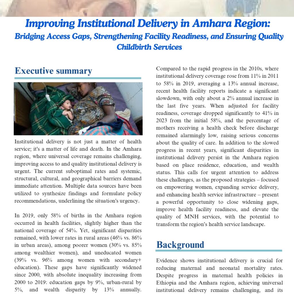 Institutional delivery is not just a matter of health service; it’s a matter of life and death. In the Amhara region, where universal coverage remains challenging, improving access to and quality institutional delivery is urgent. The current suboptimal rates and systemic, structural, cultural, and geographical barriers demand immediate attention. Multiple data sources have been utilized to synthesize findings and formulate policy recommendations, underlining the situation’s urgency.