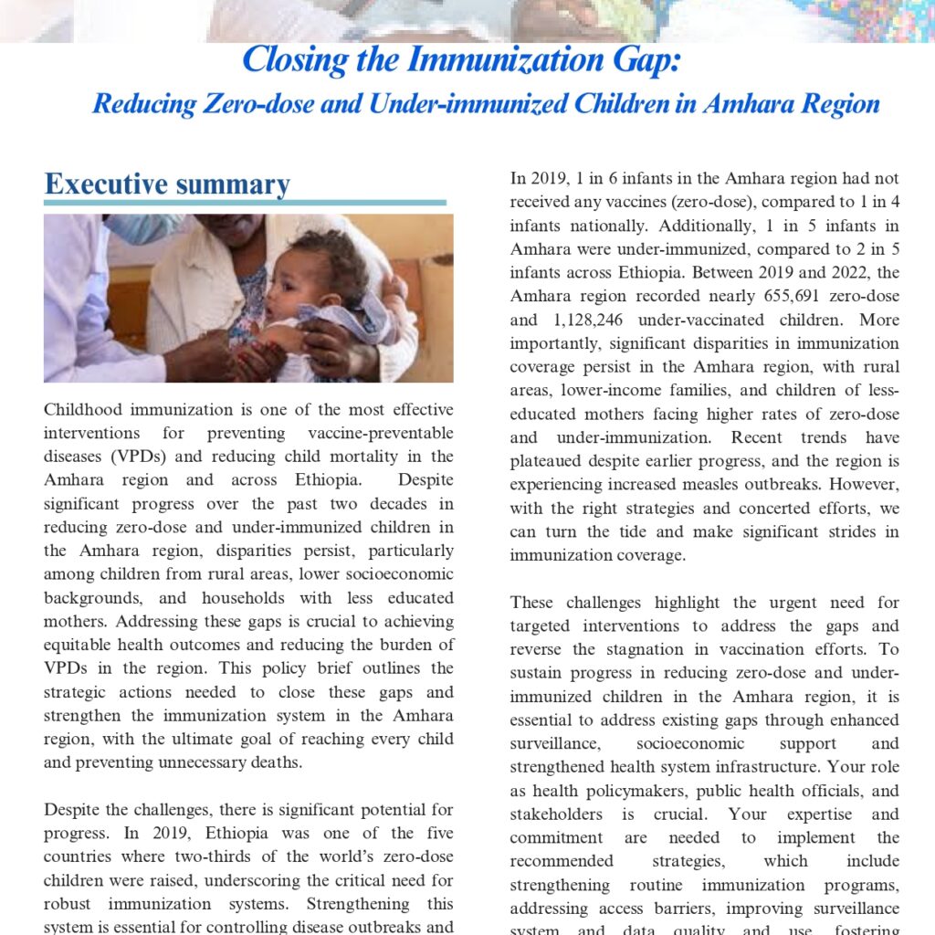 Childhood immunization is one of the most effective interventions for preventing vaccine-preventable diseases (VPDs) and reducing child mortality in the Amhara region and across Ethiopia. Despite significant progress over the past two decades in reducing zero-dose and under-immunized children in the Amhara region, disparities persist, particularly among children from rural areas, lower socioeconomic backgrounds, and households with less educated mothers. Addressing these gaps is crucial to achieving equitable health outcomes and reducing the burden of VPDs in the region. This policy brief outlines the strategic actions needed to close these gaps and strengthen the immunization system in the Amhara region, with the ultimate goal of reaching every child and preventing unnecessary deaths